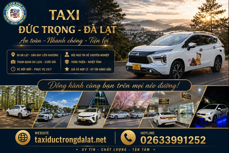 Taxi Đà Lạt là dịch vụ di chuyển tiện lợi cho du khách và người dân khi cần đặt xe nhanh, đón tận nơi, đi sân bay Liên Khương, Đức Trọng hoặc các tuyến đường dài. Taxi Đức Trọng Đà Lạt hỗ trợ xe 4 chỗ, 7 chỗ, phục vụ 24/24, báo giá rõ ràng trước chuyến đi và đưa đón đúng giờ. Liên hệ 02633 991 252 để đặt taxi Đà Lạt nhanh chóng, an toàn và tiết kiệm.